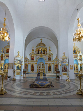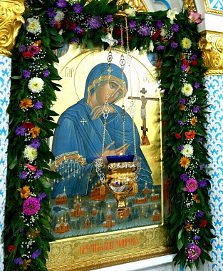У граней массивных колон в напольных кивотах помещены Богородичные иконы : «Ачаирская», «Успение», «Всецарица», «Взыскание погибших».