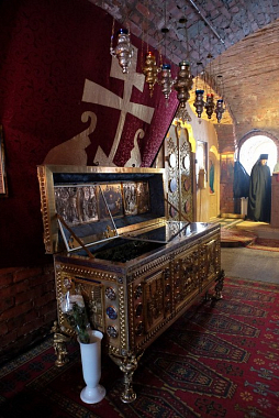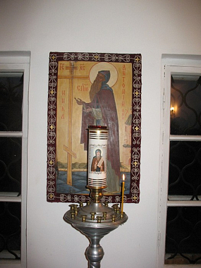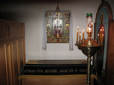 Под надгробием сделано отверстие, из которого верующие берут на память белый песок, обычно добываемый в Дымском озере. Перед гробницею стоит старинный образ Антония Великого (XVIII века) новгородского письма.
