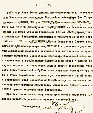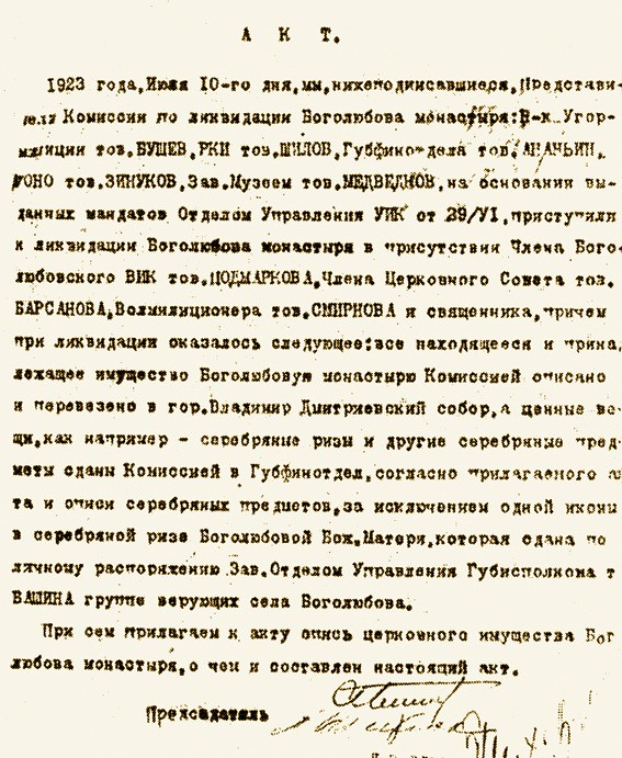 Официальной датой закрытия Боголюбского монастыря можно считать 3 июня 1923 года. Богоборцами не случайно была выбрана эта дата, ведь именно с 3 июня начинался в течение вот уже полутора веков крестный ход во Владимир с Боголюбской иконой Божией Матери. Именно эта дата стоит на акте-описи «конфискованного имущества у ликвидированного Боголюбовского монастыря».