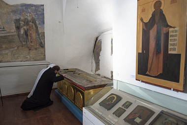 Крышкой раки является икона преподобного, где он изображен в облике седовласого старца в монашеских одеждах с развернутым свитком, на котором написаны начальные слова его духовного завещания братии. Над погребением - плохо сохранившаяся фреска 1502 года. Перед алтарем с северной стороны - еще одно возвышение в форме гробницы. Это погребение архиепископа Ростовского Иоасафа (Оболенского), ученика преподобного Мартиниана, датируемое 1513 годом.