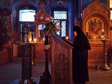обед, 14.00 – 15.45 отдых (келейное время), 15.45 – вечернее богослужение в храме либо послушания, 17.30 - ужин, 18.00 – 22.00 – келейное правило и отдых, 22.00 – полунощница в монастырском корпусе.