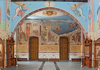 Основная часть западной стены расписана сюжетами, связанными с историей Иверской иконы Божией Матери: ее поругание воинами иконоборцами, чудесное избавление и путешествие по морю, обретение святого образа афонскими монахами.