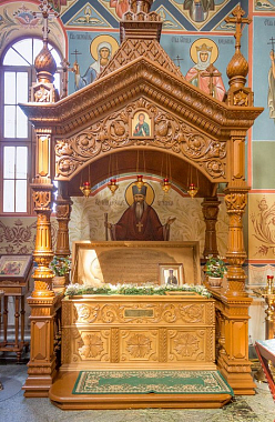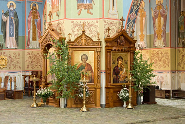 Алтарь был просторным. На горнем месте стояла большая икона Пресвятой Троицы с предстоящими внизу Божией Матерью, святыми угодниками и ангелами. Эта икона, подаренная Преосвященным Евсевием, писана на холсте, помещена в вызолоченную раму с такой же резьбой.