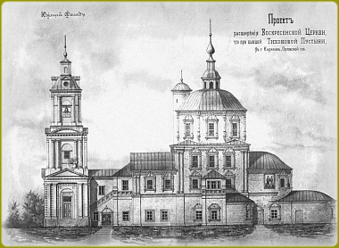 В конце XVI века иеромонахом Тихоном был основан Воскресенский монастырь, называемый также Тихоновой пустынью. До конца XVII века все постройки монастыря были деревянными. По описанию сына антиохийского патриарха, архидиакона Павла Алеппского, посетившего обитель в 1654 году на пути в Москву, деревянный соборный храм Воскресения отличался своей стройностью и высотой. Поставленный на высокий подклет и окруженный галереей с тремя входами, он имел трехчастное построение с расположенными над каждой, частью главами, легкими и изящными. Весьма высокой была и восьмигранная колокольня, завершенная куполом.