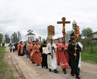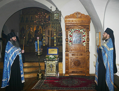 В трапезной части храма на первом столпе висел образ Рождества Пресвятой Богородицы, а вокруг образа, представлявшего собой средник, были написаны Господские и Богородичные праздники; они находились под золоченым серебряным окладом.
