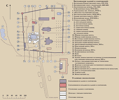 Обитель представляет собой пример позднесредневекового монастыря с регулярной композицией и ансамблем построек рубежа 17-18 вв. Территория, окруженная стенами, имеет трапециевидный план, приближающийся к ориентированному по сторонам света квадрату. От места утраченных Святых врат, располагавшихся посередине южной стороны ограды, к северу идет липовая аллея, приводящая к монастырской площади. Справа от аллеи стоит крупный объем собора Рождества Богородицы, выходящий на площадь западным фасадом, в конце аллеи - трапезная церковь Богоявления. С запада площадь ограничивает Настоятельский корпус, немного севернее - церковь Екатерины с больничными кельями. С севера стоит протяженный с запада на восток Братский корпус, а к востоку от него по той же линии руины Казначейского корпуса. Небольшой пруд прямоугольной формы расположен в северо-восточном углу территории, более крупный прямоугольный пруд, обсаженный деревьями - в юго-западной части обители. Вокруг монастыря сохранилась ограда с четырьмя квадратными и двумя круглыми башнями. В северном и южном прясле проделано трое арочных ворот. К югу от монастырского комплекса стоит здание гостиницы. Все сохранившиеся здания выстроены из кирпича, большинство из них имеет оштукатуренные или побеленные фасады.