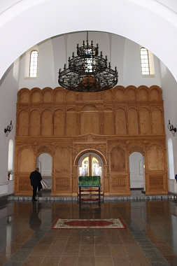 Внутреннее убранство – три резных деревянных иконостаса с писаными иконами, два резных деревянных клироса, писаные иконы в резных киотах.