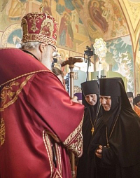 На малом входе Святейший Патриарх Кирилл возвел монахиню Неониллу (Фролову) в сан игумении и вручил ей игуменский жезл. Монахиня Неонилла была назначена на должность игумении Никольского Шостьенского монастыря решением Священного Синода от 24 декабря 2015 года (журнал № 115).