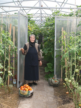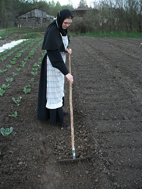 После трапезы сестры расходятся на послушания. Старшие по возрасту монахини читают псалтирь, помянники, молятся о болящих, путешествующих, страждущих, которые обращаются в монастырь за молитвенной помощью. А у молодых свои послушания. Обширное хозяйство скита требует неусыпного попечения и нелегких трудов, которые разделяют с сестрами благочестивые паломники. Сестры трудятся в трапезной, в храме, на клумбах, на огороде. Есть иконописная мастерская, где сестры пишут иконы для своего храма и на заказ. В швейной мастерской шьют монашескую одежду. Есть в скиту и своя свечная мастерская, где изготавливаются свечи для Богослужения. На небольшом расстоянии от основных построек скита находится коровник. Коровье молоко перерабатывается на молочной кухне, где изготавливается творог, сметана. Есть и своя небольшая пасека, и по милости Божьей на Великий пост сестры обеспечены медом. Послушание одной из старших сестер – зажигать на могилах лампадки, ставить цветы.