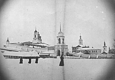 На горе, из-под подошвы которой бьет святой родник, в 1742-1757 гг. появилась церковь Сергия Радонежского с колокольней – также каменная взамен деревянной. Она считалась кладбищенской, хотя монахов и почетных мирских покойников хоронили по всей горе вплоть до Казанской церкви. Наконец, Всесвятская церковь помещалась над Святыми вратами и под колокольней (1776-1779); колокольню к началу ХХ в. украшали часы, «куранты». Ограду с четырьмя башнями по углам возвели в 1742 г. А еще были в обители три двухэтажных жилых корпуса – настоятельский и два братских, хозяйственный двор, ризница, ледник, две бани, три амбара, здание для извести, а за оградой – два гостиных корпуса и 37 ярмарочных лавочек. С востока к монастырю примыкал фруктовый сад.