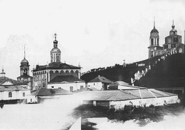 Изначально монастырь был построен при подошве высокой горы и частью на горе. Со всех сторон монастырь был обнесен каменною стеною с четырьмя башнями по углам. Стена с северной стороны была оригинальной деревянной постройки, на подобие стен царских теремов; с восточной стороны по скату горы монастырь был окаймлен фруктовым садом с каменною лестницею, шедшей от самой подошвы вверх через всю гору к церкви преподобного Сергия Радонежского.