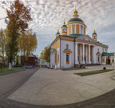 После северных Святых ворот Покровский собор – второе старейшее из сохранившихся сооружение Хотькова монастыря, характерный образец пятиглавого храма эпохи классицизма. Благодаря простой и гармоничной архитектуре он стал главным украшением обители.
