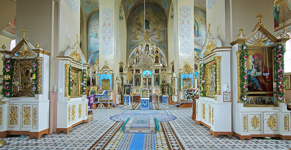 Трехпрестольный, рассчитанный на 1200 человек, он вместителен и просторен. Средний, главный престол посвящен Успению Божией Матери; правый, южный придел – преподобному Серафиму Саровскому Чудотворцу, «печальнику земли русской», и преподобному Иоанну Лествичнику, наставнику монашества; левый, северный – почитаемому святителю Николаю Мирликийскому Чудотворцу и великомученику Димитрию Солунскому Мироточивому.
