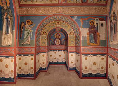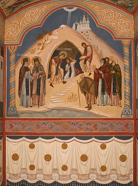Велика была радость святогорской братии: новооткрытый храм спешили отделать и вновь освятить, причём эконом упросил отца Арсения, для большаго простора, расширить его притворами направо и налево, которые, под непосредственным его руководством и были выкопаны в земле руками иноков. Таким образом, если предположить, что храм этот в древности ископали иноки, — в новейшее время откопали, очистили и распространили его тоже исключительно иноки».