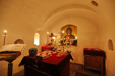 Эконом монастыря, монах Иоанникий (будущий преподобный Иоанн Затворник), возглавивший работы по расчистке древнего святилища, собственноручно вырубил для новооткрытого храма из цельного дикого камня Престол.
