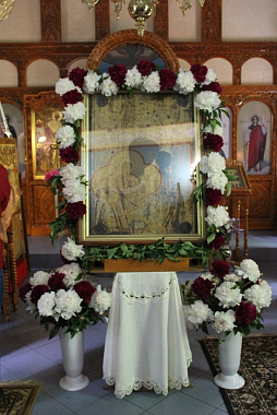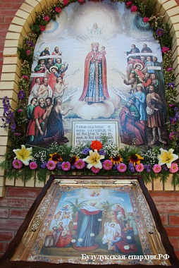 Исторический храм на пещерах был освящен в 1903 году в честь иконы, прославившейся в 1888 году в Санкт-Петербурге. Молния, ударившая в часовню у стеклянного завода, обожгла внутреннее пространство здания, но образ Божией Матери оказался не затронут огнем. Из разбившейся кружки с пожертвованиями вылетели монеты, которые и прилепились к иконе. В скором времени страждущие люди стали получать исцеления от болезней. Список с этой иконы в 1897 году заказал игумен Михаил – настоятель Бузулукского монастыря. Образ встретили при большом стечении народа, и, вскоре, он также прославился чудотворениями, именуется эта икона образом Божией Матери ««Всех скорбящих Радости» (с грошиками).