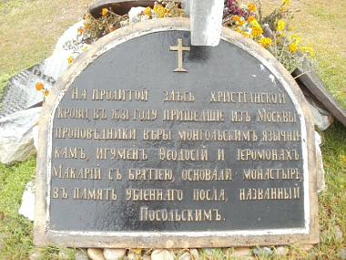 В 1681 году Поместный Собор Русской Православной Церкви под председательством царя Феодора Алексеевича и патриарха Иоакима принял решение об отправке в Забайкалье Даурской духовной миссии во главе с игуменом Феодосием и иеромонахом Макарием для просвещения моногльских народов светом православной веры и поддержания ее в русских переселенцах. От Собора миссия получила такое наставление: «Приехав в Даурию, в Селенгинске и других городах и острогах приглашать всяких иноверцев к христианской вере православной, поучать со всем тщанием и ревностью из Божественного Писания и крестить. Опасаться, чтобы какими-нибудь строптивыми словами не отдалить иноверцев от святого дела». В этом же году, прибыв в Забайкалье, члены миссии основали Селенгинский Свято-Троицкий мужской монастырь и в память убиенных послов - Николаевскую Пустынь на Посольском мысу. В дальнейшем эта пустынь была преобразована в Спасо-Преображенский Посольский монастырь.