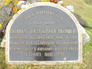 Их товарищи остались на судне охранять государеву казну. Неожиданно на гревшихся у костра налетело около ста мунгальских разбойников, и несчастные российские посланники, не успев схватиться за оружие, были убиты и ограблены. Напавшие хотели захватить судно, надеясь на богатую добычу. Но казаки с корабля начали отстреливаться из огнестрельного оружия и отогнали грабителей. Тела убитых были погребены на холме, причем отец и сын Заболоцкие в одной могиле. Так погибли члены первого российского посольства в Монголию, пришедшие в эти земли для установления дружеских взаимоотношений между русским и монгольским народами. Но их гибель все же не была напрасной. Она явилась причиной возникновения здесь Посольского монастыря и его села, а главное - значительно ускорила процесс освоения Россией Забайкалья.