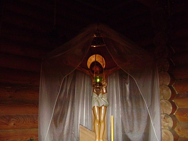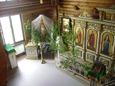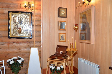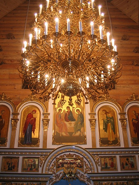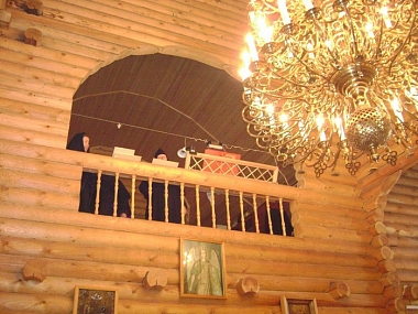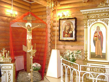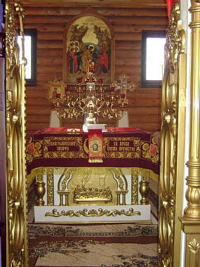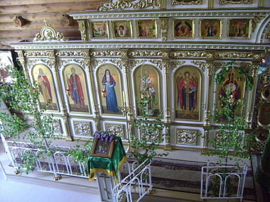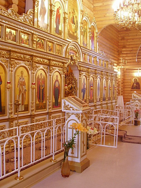 Первая, построенная в мужском монастыре деревянная церковь была во имя Святителя Николая; при ней находился придел, к северной стороне, во имя Соловецких чудотворцев Зосимы и Савватия. Иконостас означенной церкви был самый простой и незатейливой работы. Икон замечательных в каком-либо отношении не было, кроме резной иконы Святителя Николая, к которой монахи и миряне имели глубокое благоговение, что и доказывали усердным служением молебнов и различными прикладами.