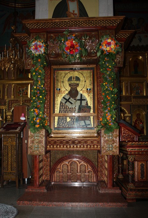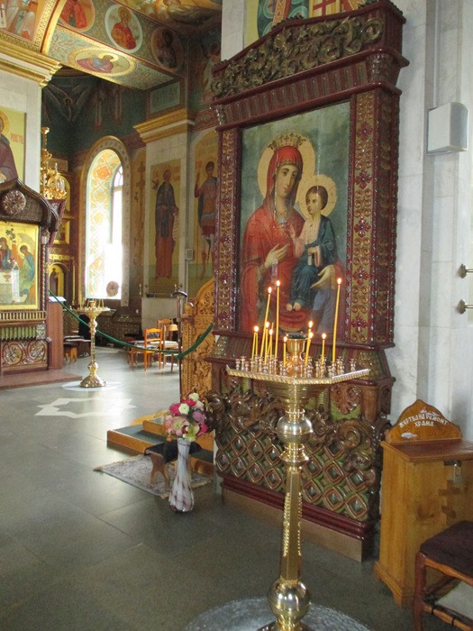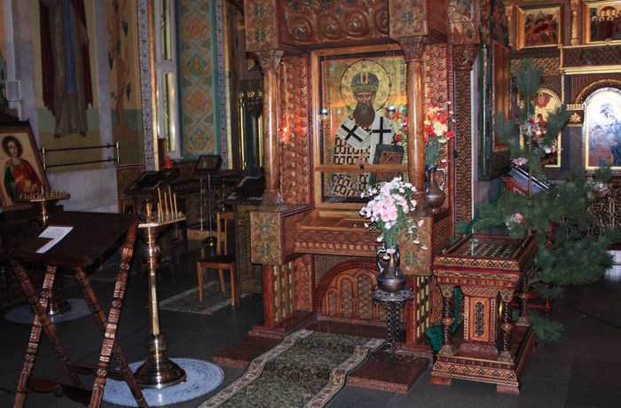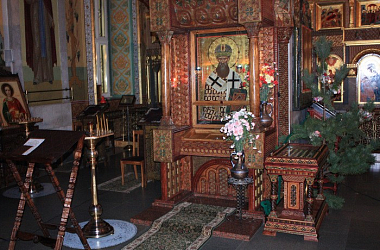 В левой части храма у окна стоит ряд чтимых икон – вмч. Пантелеимона Целителя, Пресвятой Богородицы «Елеуса», что в переводе с греческого означает «Милующая», и святителя Николая Чудотворца.