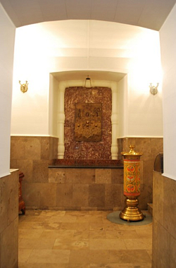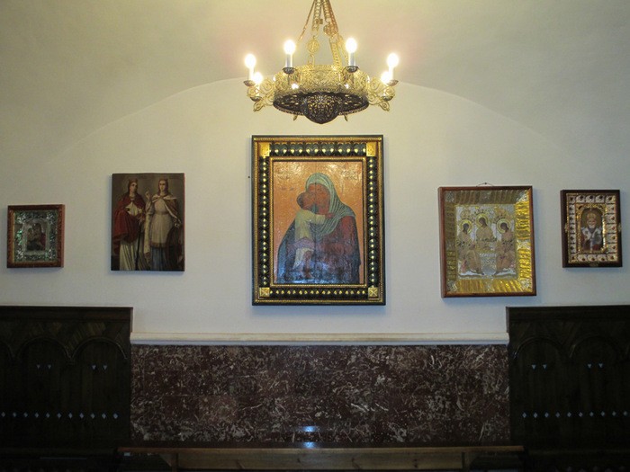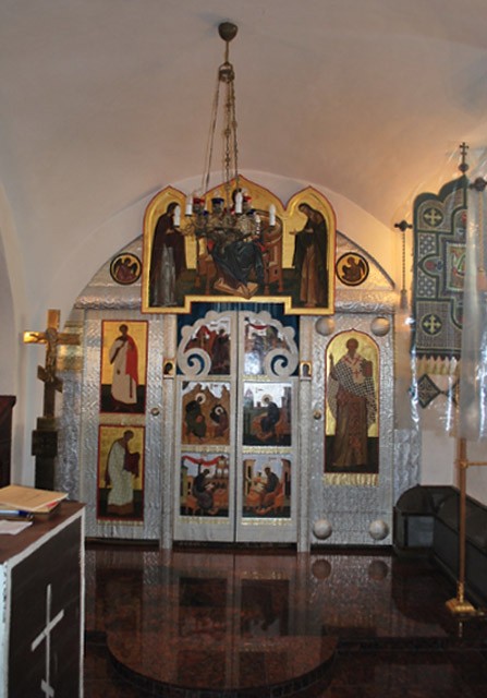 С другой стороны от окна находится Распятие Спасителя и две старинные иконы Божией Матери, пожертвованные монастырю в 2010 году: иконы «Взыскание погибших» и «Достойно есть».