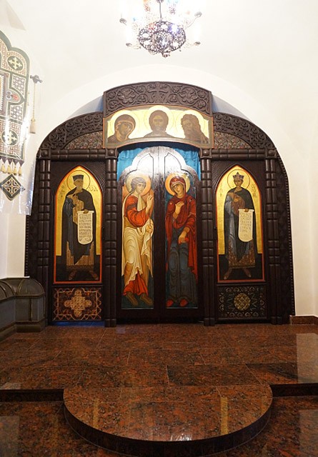 Внутренний интерьер храма очень аскетичен – не расписанные стены, каменный престол, деревянный иконостас. Это создает особую молитвенную атмосферу, так необходимую для внутреннего сосредоточения.Особый интерес представляет собой деревянный иконостас нижнего храма. Иконы Царских врат были выполнены сестрами обители. Эти Царские врата – копия древних Царских врат XVI века из церкви Вознесения (церкви Исидора Блаженного) в Ростове Великом. Работая над копией этого уникального памятника древнерусской резьбы, сестры в новых Царских вратах восполнили утраченные в оригинале фрагменты в соответствии с древнерусской традицией XVI века.