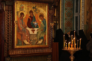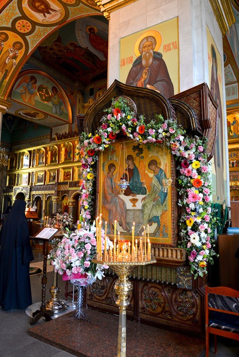 Главными святынями этого храма являются три чтимые иконы монастыря – икона Пресвятой Троицы, Иверская икона Божией Матери и икона святителя Тихона Задонского.
