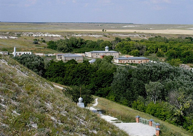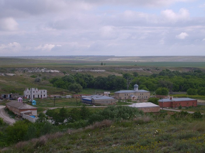 Ближайшие населенные пункты к Монастырю - Каменный Брод (4 км) и Михайловка (3 км), между которыми и располагается монастырь. От Ольховки до монастыря по карте 13 км точно на юго-запад.