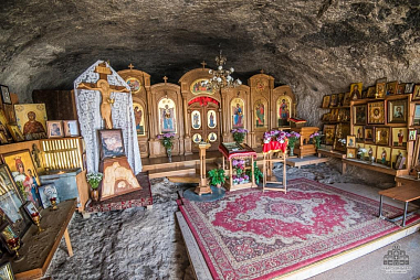 Здесь есть и кельи монахов, часть из которых является очень маленькими и имеет чрезвычайно низкие потолки, и складские пещеры, и большой трапезный зал, и покои эконома и, самое главное, собственный пещерный храм. Храм разместился в одном из больших естественных гротов, площадь которого боле ста пятидесяти квадратных метров. Этот грот отличается наличием скругленной формы. Он сужается к западу и востоку. Для алтаря тут было вырублено специальное углубление прямоугольной формы. В стенах этого углубления разместили несколько ниш. Апсида отделяется от остальной части этого пещерного храма благодаря наличию невысокой алтарной преграды. В северо-восточной части храма находится купель.