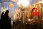 Молитвенный подвиг преподобного Серафима изображен на стене напротив: старец, преклонив колени с воздетыми к небу руками, молит Пресвятую Троицу о спасении Земли Русской.