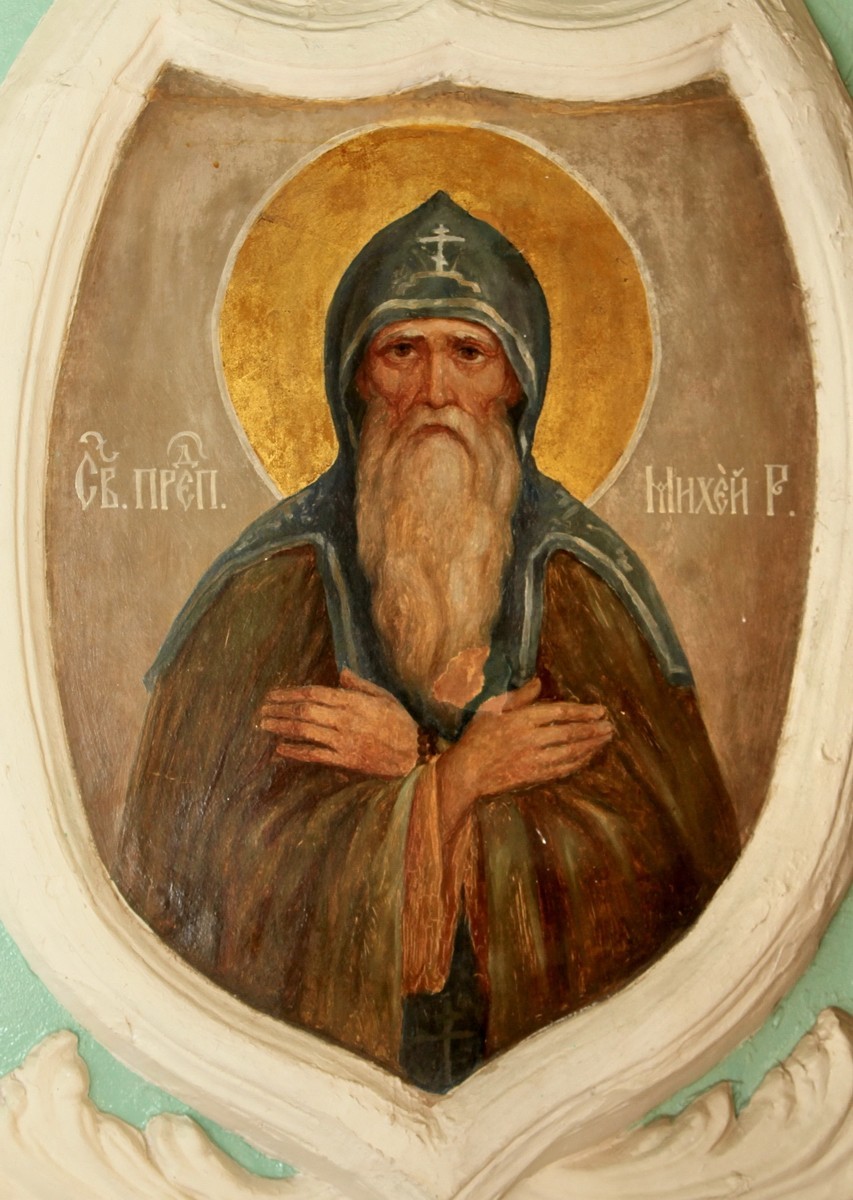 О преблаженне и Богомудре отче Михее! Ты истиннаго Пастыря Христа заповеди исполняя, всяко веселие, еже в мире, возненавидел еси и житие твое в слезах препровождал еси, телесныя страсти до конца умерщвляя и во всем последуя житию учителя твоего преподобнаго Сергия, с нимже и сподобился еси видети Небесную Царицу, Пресвятую Богородицу, посещающую вас и благодатне обещавающую, яко неотступна будет от места сего. О таковей, данней тебе благодати, ведуще мы, яко и ныне купно с Богоносным аввою твоим во обителях света обитаеши и Господу предстоиши, смиренно молим тя, к честней раце твоей припадающе: не престани вкупе с ним моляся о нас ко Господу нашему Иисусу Христу и Пречистей Его Матери, о еже сохранити страну нашу в мире и благопребывании, победу на враги даровати, всем же нам во благочестии и чистоте и взаимной любви тихое и безмолвное житие устроити, от глада, губительства, огня, меча, междоусобныя брани и от всякия беды и нужды нас избавити, да, спасени душею же и телом, единодушно славим в Троице славимаго Бога, Отца, и Сына, и Святаго Духа, ныне, и присно, и во веки веков. Аминь.Среди учеников и последователей преподобного Сергия Радонежского особое место занимает его любимый келейник Михей, «возливавший», по словам Епифания Премудрого, «воду на руце его». Сведений о жизни преподобного Михея сохранилось немного. Известно, однако, что он принадлежал к числу первых учеников преподобного Сергия и входил в узкий круг его сподвижников, которых основатель Троицкой обители посвящал в свой опыт таинственного общения с Богом.