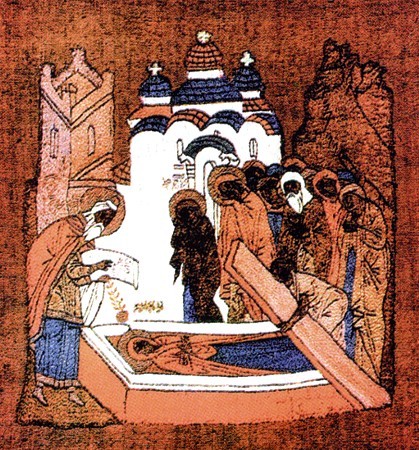 Жизнь рождшую во чреве носила еси, Чистую Богоматерь,/ богомудрая Анно./ Темже к приятию Небесному, идеже веселящихся жилище,/ в славе радующися, ныне преставилася еси,/ чтущим тя любовию/ прегрешений просящи очищение,// присноблаженная.