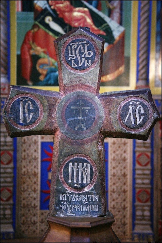 В четырех циркульно прочерченных кругах на лопастях надписи из заглубленных букв: «Ц(А)РЬ СЛ(А)ВЫ» (вверху), «I(ИСУ)С» (слева), «Х(РИСТО)С» (справа), «НIКА» (внизу).