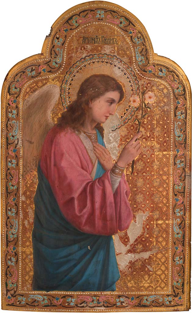 В 1922 г., когда Святогорский монастырь был закрыт, и в его стенах разместился Дом отдыха, новые владельцы Святогорья рубили иконы на дрова и топили ими кочегарку. Когда один кочегар разбирал привезенные ему для топки порубленные иконы, то увидел одну неповрежденную — икону Архангела Гавриила. Желая сохранить святыню, он спрятал ее в куче угля. Его сменщик, не зная о спрятанной иконе, набирая уголь задел лезвием лопаты образ Архангела. Но чудом Божиим лик и руки Архангела Гавриила сохранились невредимы, хотя фон оказался поврежденным.