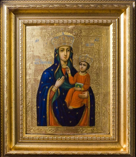 Новодворская икона Пресвятой Богородицы представляет собой поясное изображение Богоматери с Божественным Младенцем на Ее левой руке, главы Которых украшены венцами.