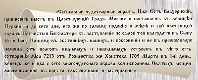 Вообще, надписи на иконах служили своего рода документом, а нередко и летописным повествованием. На деденевской иконе такая запись относительно небольшая, по ней и реконструируется ее происхождение. В первой части записи говорится о многочудесной Влахернской иконе, принесенной в Москву, во второй – удостоверяется, что данное повторение сделано по ее образу и подобию 1 марта 1705 года, третья часть говорит о том, что эта икона – мощевик.
