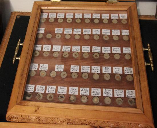 В ковчеге находятся частицы мощей святых: Иоанна Воина, Иоанна Тульского,Поликарпа Смирского и др.