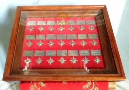 Вставлены частицы мощей святых: прп. Иова Почаевского, свт. Игнатия Мариупольского, свт. Игнатия Ростовского, равноап. Марии Магдалины, свт. Афанасия Константинопольского, свт. Иннокентия Херсонского, блж. Василия Московского, свт. Иннокентия Иркутского, свт. Феофана Затворника, св. бесcр. Дамиана, ап. Андря Первозванного, вмц. Варвары, свт. Иннокентия Московского, прпп. Зосимы, Савватия и Германа Соловецких, свт. Луки Крымского, прпмчч. Хозевитских, сщмч. Харлампия, прпмчч. Вифлеемских, свт. Митрофана Воронежского, прп. Амвросия Оптинского.