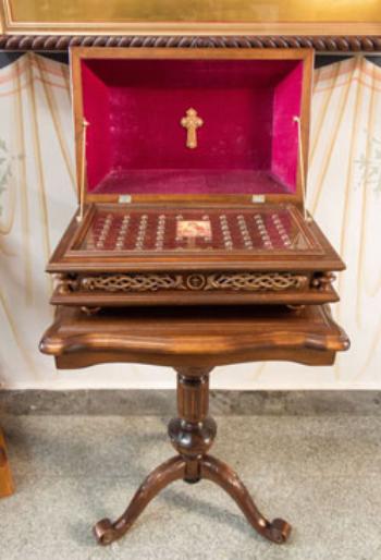Частицы сощей святых Иоанна Предтечи, апостола Андрея Первозванного, равноапостольной Марии Магдалины, святителей Игнатия Брянчанинова, Димитрия Ростовского, Тихона, Филарета и Иннокентия Московских, ФеофанаЗатворника Вышенского, Луки Крымского, Митрофана Воронежского, великомученика Георгия Победоносца, мучеников Иоанна Воина и Трифона, Вифлиемских мучеников, преподобных Старцев Оптинских, Серафима Саровского, Зосимы, Савватия и Германа Соловецких, Феодора Санаксарского, святителя Феодисия и преподобного Лаврентия Черниговских, преподобного Максима Грека и многие другие.