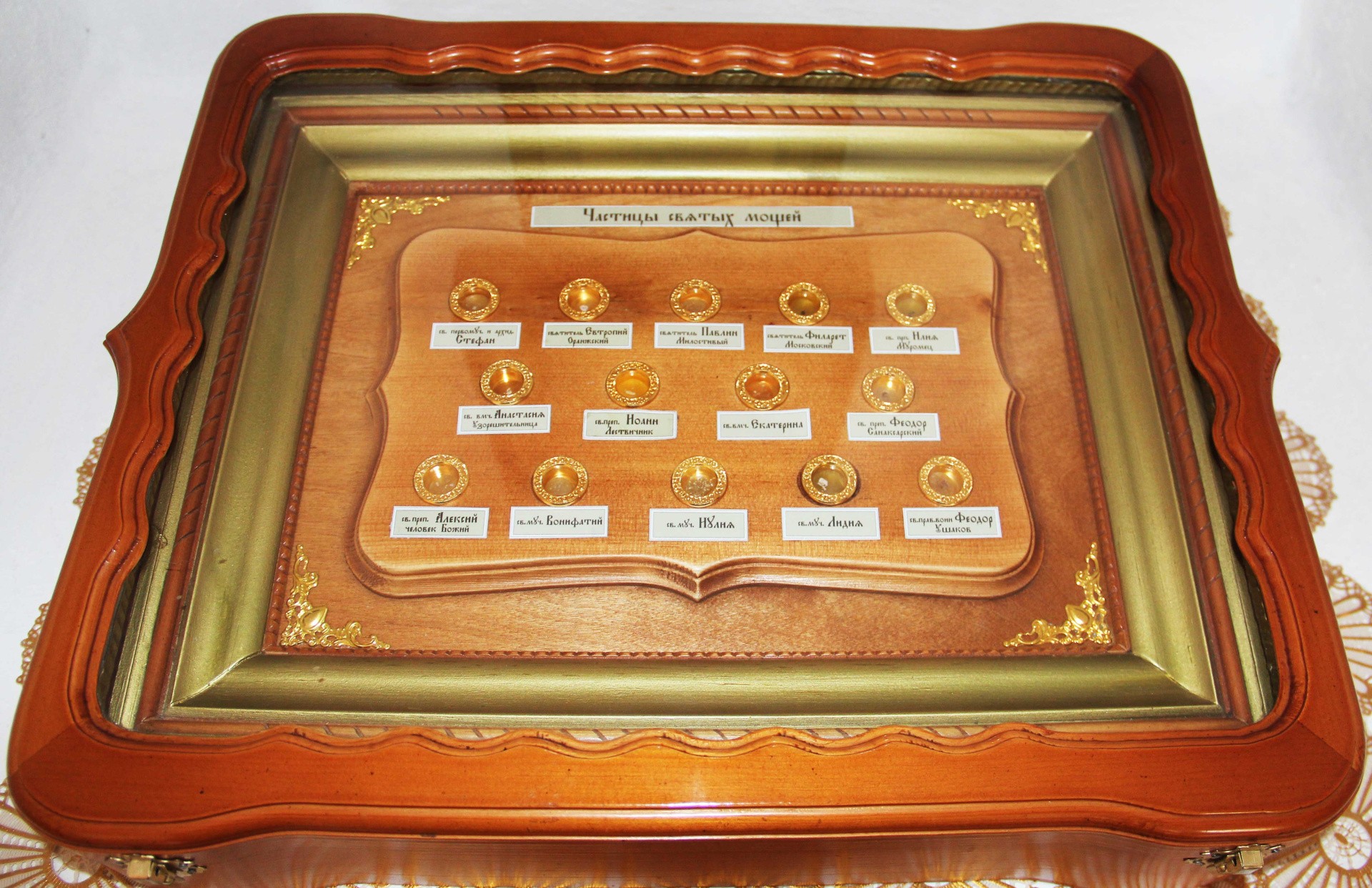 Частицы святых мощей: первомученика и архидиакона Стефана, святителя Евтропия Оранжского, святителя Павлина Милостивого, святителя Филарета Московского, преподобного Илии Муромца, великомученицы Анастасии Узорешительницы, преподобного Иоанна Лествичника, великомученицы Екатерины, преподобного Феодора Санаксарского, преподобного Алексия человека Божия, мученика Вонифатия, мученицы Иулии, мученицы Лидии, праведного воина Феодора Ушакова.