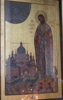 Создание этого образа неразрывно связано с возрождением профессиональных иконописных традиций в нашей святой обители и созданием иконописной мастерской, которую возглавил Димитрий Геннадиевич Мироненко. Мастерская была создана в 1997 году. И первой коллективной работой иконописцев стала икона Божией Матери «Всех скорбящих радость». В этом же году была написана икона святого благоверного князя. По своей иконографии образ напоминает поясную икону Александра Невского XVIII века из собрания домашних икон священномученика митрополита Серафима (Чичагова), находящуюся сейчас в Покровском приделе Свято-Троицкого собора. Святой благоверный князь изображен в рост. Мечь в его руках указывает на историческую роль Александра Невского как защитника Русской земли. Он молитвенно предстоит образу Троицы. Смиренно склонив главу князь молится и об обители, и о городе, и о всей земле Российской. Внизу расположен символический образ Александро-Невской Лавры. Горки внизу символизируют те земли, которые русский народ смог отстоять благодаря подвигу великого князя. Размеры киота иконы (112Х79).