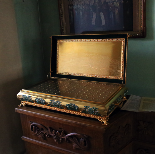 Мощевик с частицами 82 мощей преподобных и святителей, подвизавшихся в пещерах Свято-Успенской Киево-Печерской Лавры.