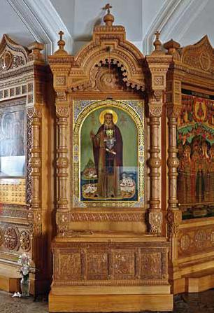 Напротив Валаамской иконы Божией Матери (слева) можно увидеть резную раку. В ней покоятся мощи прп. Антипы Валаамского (Афонского), уроженца Молдавии, долгое время подвизавшегося на Афоне. В Афонском монастыре он принимал деятельное участие в устроении румынского скита Продром, а затем приехал в Россию для сбора пожертвований. Живя в Петербурге, Антипа совершил паломничество в Валаамский монастырь, где, испросив благословение афонских и молдавских старцев, провел последние 17 лет своей жизни.