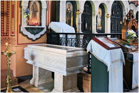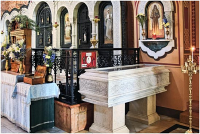 Хранятся в отдельных раках по обе стороны солеи. Первоначально, после перенесения из Китая, тела были погребены в крипте церкви в соответствии с волей великой княгини. После прославления Русской православной Церковью заграницей в лике святых 1 мая 1982 года, в день празднования Недели святых жен-мироносиц, их мощи были перенесены из крипты в храм.