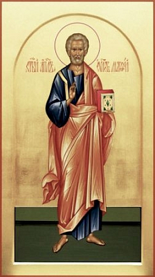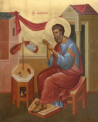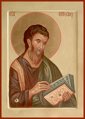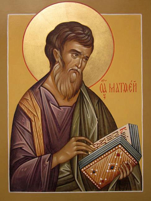 Был апостолом из двенадцати. До обращения ко Христу Матфей служил мытарем, сборщиком податей для Рима. Услышав глас Иисуса Христа: «Иди за Мной» (Мф.9.9), он оставил свою должность и пошел за Спасителем. Восприняв благодатные дары Духа Святого, апостол Матфей вначале проповедовал в Палестине. Перед уходом на проповедь в дальние страны по просьбе иудеев, остававшихся в Иерусалиме, апостол написал Евангелие. В ряду книг Нового Завета Евангелие от Матфея стоит первым. Написано на еврейском языке. Речи и деяния Спасителя Матфей излагает в соответствии трем сторонам служения Христа: как Пророка и Законодателя, Царя над миром невидимым и видимым и Первосвященника, Приносящего Жертву за грехи всех людей.