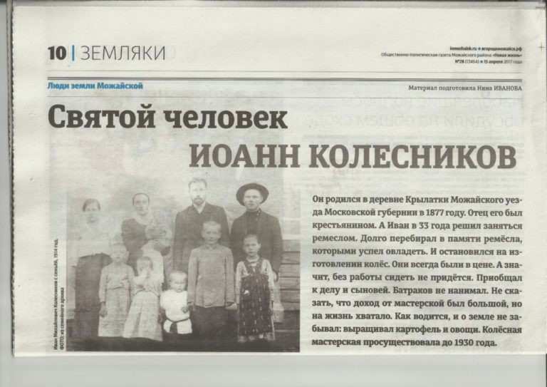 Му­че­ник Иоанн ро­дил­ся в 1877 го­ду в се­ле Кры­лат­ка Гла­зов­ской во­ло­сти Мо­жай­ско­го уез­да Мос­ков­ской гу­бер­нии в се­мье кре­стья­ни­на Ми­ха­и­ла Ко­лес­ни­ко­ва. В 1910 го­ду Иван Ми­хай­ло­вич за­вел ко­лес­ную ма­стер­скую, в ко­то­рой ра­бо­тал со сво­и­ми сы­но­вья­ми, не при­вле­кая ко­го-ли­бо из ра­бо­чих со сто­ро­ны. Эта ко­лес­ная ма­стер­ская про­су­ще­ство­ва­ла у него до 1930 го­да.С юно­сти Иван Ми­хай­ло­вич был вос­пи­тан в бла­го­че­стии и пел на кли­ро­се в хра­ме Рож­де­ства Бо­го­ро­ди­цы в се­ле По­ре­чье Мо­жай­ско­го уез­да*. В 1934 го­ду он был из­бран чле­ном цер­ков­но­го со­ве­та и пред­се­да­те­лем ре­ви­зи­он­ной ко­мис­сии. Это бы­ло тя­же­лое вре­мя го­не­ний на Рус­скую Пра­во­слав­ную Цер­ковь. В 1937 го­ду в По­ре­чье был аре­сто­ван свя­щен­ник, и при­хо­жане оста­лись без служ­бы. При­ход по­ста­но­вил на­пра­вить Ива­на Ми­хай­ло­ви­ча в Моск­ву в Пат­ри­ар­хию с прось­бой к свя­щен­но­на­ча­лию при­слать им свя­щен­ни­ка. Иван Ми­хай­ло­вич вер­нул­ся до­мой с но­вым свя­щен­ни­ком, и к об­ще­му удо­вле­тво­ре­нию всех ве­ру­ю­щих бо­го­слу­же­ние в хра­ме воз­об­но­ви­лось. Но не на­дол­го.5 фев­ра­ля 1938 го­да бы­ли аре­сто­ва­ны свя­щен­ник и диа­кон, а 1 ап­ре­ля – Иван Ми­хай­ло­вич и мо­на­хи­ни, по­мо­гав­шие в хра­ме. Иван Ми­хай­ло­вич был за­клю­чен в мо­жай­скую тюрь­му и в тот же день до­про­шен. Два при­вле­чен­ных по де­лу лже­сви­де­те­ля ого­во­ри­ли его: один по­сто­ян­но при­вле­кал­ся к та­ко­го ро­да де­лам в ка­че­стве лже­сви­де­те­ля, а дру­го­го уго­во­рил сле­до­ва­тель.– Сви­де­те­ля­ми уста­нов­ле­но, – за­явил сле­до­ва­тель, – что вы со­сто­и­те в груп­пи­ров­ке цер­ков­ни­ков, рас­про­стра­ня­е­те кле­ве­ту про­тив пар­тии и пра­ви­тель­ства. Вы под­твер­жда­е­те дан­ный факт?– В груп­пи­ров­ке цер­ков­ни­ков я не со­сто­ял и контр­ре­во­лю­ци­он­ной кле­ве­ты не рас­про­стра­нял.Вы­зван­ный на оч­ную став­ку со лже­сви­де­те­ля­ми, Иван Ми­хай­ло­вич ска­зал, что с од­ним из них он не встре­чал­ся, так чтобы ве­сти с ним раз­го­во­ры, а дру­гой воз­во­дит на него оче­вид­ную на­прас­ли­ну и все его по­ка­за­ния он от­ри­ца­ет.7 июня 1938 го­да трой­ка НКВД при­го­во­ри­ла Ива­на Ми­хай­ло­ви­ча к де­ся­ти го­дам за­клю­че­ния в ис­пра­ви­тель­но-тру­до­вом ла­ге­ре, и он был от­прав­лен в Ма­га­дан. 4 ап­ре­ля 1939 го­да Иван Ми­хай­ло­вич был пе­ре­ве­ден в ла­герь в Ке­ме­ров­ской об­ла­сти. Несо­глас­ный с при­го­во­ром, он от­пра­вил жа­ло­бу вла­стям, в ко­то­рой на­пи­сал, что его осу­ди­ли непра­во вслед­ствие кле­ве­ты. Де­ло бы­ло пе­ре­смот­ре­но, и в ян­ва­ре 1940 го­да про­ку­рор пред­ло­жил де­ло пре­кра­тить за недо­ка­зан­но­стью об­ви­не­ния. 8 мая 1940 го­да Управ­ле­ние НКВД по Мос­ков­ской об­ла­сти ста­ло хо­да­тай­ство­вать пе­ред Осо­бым Со­ве­ща­ни­ем НКВД о сни­же­нии сро­ка на­ка­за­ния за­клю­чен­но­му Ко­лес­ни­ко­ву Ива­ну Ми­хай­ло­ви­чу с де­ся­ти до трех лет. Од­на­ко из это­го хо­да­тай­ства ни­че­го не по­сле­до­ва­ло.Иван Ми­хай­ло­вич Ко­лес­ни­ков скон­чал­ся 17 ап­ре­ля 1943 го­да во 2‑м лаг­пунк­те Тай­гин­ско­го от­де­ле­ния Си­б­ла­га в Ке­ме­ров­ской об­ла­сти и был по­гре­бен на ла­гер­ном клад­би­ще в мо­ги­ле под но­ме­ром Е-31.