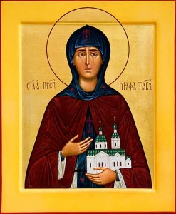 Марфа, старшая из сестер, довольно рано обнаружила стремление к подвижнической жизни. С малых лет она перестала употреблять скоромную пищу, а в последствии не употребляла даже рыбы и постного масла. Еще ребенком, находясь под присмотром няни, Марфа часто среди ночи вставала со свой постели и начинала молиться перед иконами. Маленькая девочка уже знала, что такое молитва, так как этому научилась от своих родителей с самого раннего возраста. Однако всему должна быть своя мера, и когда няня, а затем мать, узнавшая о ее ночных бдениях, начинала бранить малютку, то Марфа со слезами рассказывала, что ночью “светлый юноша” являлся ей и побуждал молиться. К этим ранним подвигам поста и молитвы Марфа призывала и своих сверстниц, живших по соседству девочек одного с нею возраста. Выходя из дома, она собирала вокруг себя подруг и, вместо игр, которых чуждалась, рассказывала им, как умела, слышанное ею: о Царствии Небесном, о венцах за пост и молитву.