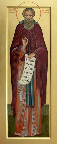 Ви́дѣвъ въ и́ночествѣ опло́тъ и огражде́ніе отъ суеты́ мірскíя и душевре́дныхъ по́мысловъ, преподо́бне, въ ю́ныхъ лѣ́тѣхъ, потща́лся еси́ прія́ти на ся́ а́нгельскій о́бразъ, смире́ннѣ взыва́я всеви́дящему Храни́телю ду́шъ и тѣле́съ: Аллилу́ія.