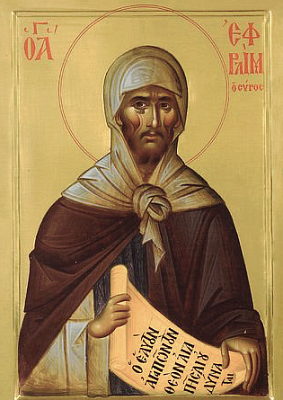 тропарь, глас 8. Слезами твоих источников пустыни безъчадное напоил еси и, еже из глубины, воздыхании во сто труды уплодоносил еси - и бысть светильник вселенней, сияя чудесы, Ефреме-отче наш, моли Христа-Бога спастися душам нашим. Слава, и ныне. Иже нас ради Рождеи Ся от Девы и распятие претерпев, Благии, Испровергии смертию смерть и восресение Явлеи яко Бог - не презри, их же созда рукою Своею, - яви человеколюбие Свое, Милостиве, - приими рождьшую Тя - Богородицу, Молящуюся за нас, - и спаси, Спасе наш, люди согрешьшыя.Канон, поем в глас 6. Песнь 1, ирмос: Яко по суху ходив израиль по бездне стопами, гонителя фараона видя потопляема - Богу победную песнь поем, вопияше.ЗАПЕВ. Преподобне отче Ефреме, моли Бога о нас. Евъфратъским одождением - твоими молитвами душю мою напой, изъсохшую зноем страстей. И слово ми вдохни, твой восхваляющу праздник, преблаженне.ЗАПЕВ. Свет мысленыи облистал еси - светло явился еси солнце: добродетельми светолучными и учении добротами, Ефреме, озаряя верных все исполнение.СЛАВА. Струями слез пламень страстей погасив, был еси сосуд честен, Ефреме, Святаго Духа - источник источая учением, Богоблаженне.И НЫНЕ. Нетленно Слово во утробе приимши, родила еси - Избавляющаго от тли Тому служащыя присно, Мати-Дево, Чистая, Двери - воистину - Живота.Песнь 3, ирмос: Несть Свята, якоже Ты, Господи, Боже мой, - Вознесыи рог верных Си, Блаже, и Утвердивыи их на камени исповедания Ти.ЗАПЕВ. Тины всякия страстныя себе очищь - явил ся еси приятилище добродетелем, воистину, и сосуд въмещен дарованиям Святаго Духа.ЗАПЕВ. Никакоже сна очима подав - храм явил ся еси Святей Троице и Премудрости сокровище, мир обогащая златозарными учении, блаженне.СЛАВА. Познавает другии Ефрат Христова честная Церкви: златыми течении напояюща мудрых учения водами - и тварь всю напояюща.И НЫНЕ. Во двою естеству - единыи от Святыя Троицы - от чистых Твоих кровий воплощь Ся, Боголепно пройде, яже от Адама спасая благостию, О, Пречистая.седален, глас 5. Сокровище Премудрости тайнам Христовем, чашю Божественаго умиления - воспоем вернии в памяти его: тезоименно бо всегда сердца верных веселит утешении Божествеными Ефрем, яко делатель и таиник Господним откровением. Слава, и ныне. Богородичен: Теплая Предстательнице, и Непобедимая, Упование известное и непостыдное, Стено и Покрове, и Пристанище притекающим Ти, присно Дево, Чистая, - Сына Своего и Бога моли со Ангелы Мир даровати мiрови и спасение и велию милость. Кресто-Богородичный: Крестом Сына Твоего, Богоблагодатная, идольская лесть вся упразднися и бесовъская крепость попрана бысть, сего ради вернии подолгу Тя присно поем и благословим и, Богородицу - воистину! - исповедающе, величаем.Песнь 4, ирмос. Христос мне - Сила, Бог и Господь - честная Церкви Боголепно зовет, вопиющи от совести чисты, о Господе празднующи.ЗАПЕВ. Сила глаголом твоим протече весь мир, высоко творя сиянием смирения, отгоня ослепление душам, блаженне.ЗАПЕВ. Непорочно прошел еси житие, слезами себе омывая - и Судии всех Пришествие написуя словесы мудрыми, Богоявленне, досточюдне.ЗАПЕВ. Видев твоего смирения преславную высоту Господь - дарует тебе слово высокотворно, имже ересем лютая возношения смиришася.СЛАВА. Укрепль себя благодатию Вседержителя - ополчи себя къ началом бесовъским, отче, - и победил еси, о нас моляся тепле, восхваляющих тя.И НЫНЕ. Яко Боже