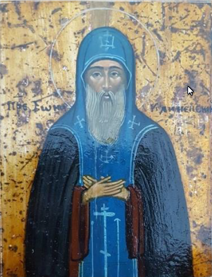 Ангельскому житию поревновав, блаженне Ионо,/ оставил еси отечество твое, великий Новград,/ и, пришед в пределы Олонецкия/ и в пустыню вселився,/ в трудех, молитвах и слезах подвизался еси, /и, яко мудрый купец, Царствие Небесное наследовал еси./ Темже любовию вопием ти:// моли Христа Бога, да спасет души наша.